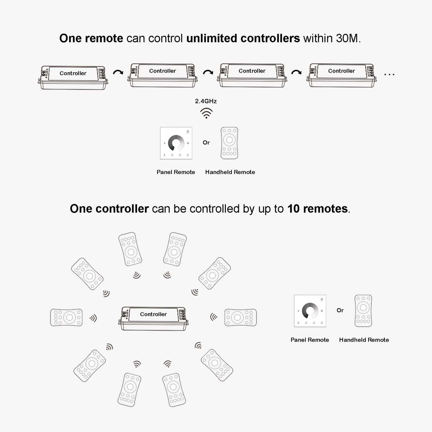 A single wireless RF 2.4GHz can be paired to an unlimited number of controllers allowing a single remote to control multiple rooms or areas. While a single controller can be paired with up to 10 remotes. This overall, will give a greater flexibility in the controls of multizone controls.